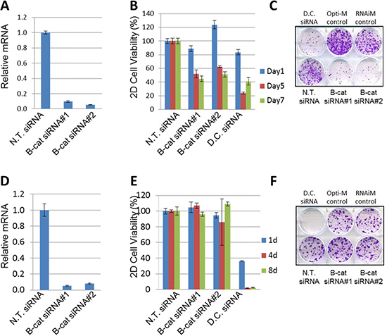 Figure 2: Silencing of β-catenin in HUH6, but not in SNU387 cells, leads to cell growth inhibition. (A) Taqman analysis of β-catenin target knock-down by two independent siRNAs compared to N.T. siRNA in HUH6 cells. (B) β-catenin knock-down by two independent siRNAs inhibits viability of HUH6 cells. (C) Representative 2D colony formation assay in HUH6 cells. (D) β-catenin knockdown by two independent siRNAs compared to the N.T. siRNA in SNU387 cells. (E) β-catenin knockdown by two independent siRNAs does not inhibit the viability of SNU387 cells. (F) Representative 2D colony formation assay in SNU387 cells. N.T. siRNA stands for non-targeting siRNA. D.C. siRNA stands for Death Control siRNA.