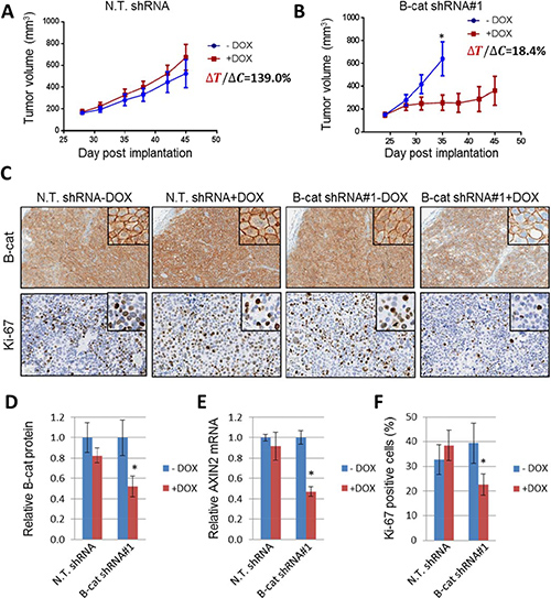 Figure 5: Inducible knock-down of β-catenin suppresses growth of Hep3B HCC tumor xenografts. Tumor growth of Hep3B xenografts expressing non-targeting shRNA (A) or β-catenin shRNA#1 (B). Tumor volume was measured on indicated days as described in Materials and Methods (n = 8 per group). Error bars represent SD of the mean. *p < 0.05. (C) IHC for β-catenin and proliferation marker Ki-67 in Hep3B tumors expressing non-targeting shRNA or β-catenin shRNA#1, with or without doxycycline treatment. (D) Quantification of β-catenin immunoblot analysis of Hep3B tumors expressing non-targeting shRNA or β-catenin shRNA#1, with and without doxycycline treatment. (E) Taqman analysis of AXIN2 levels in Hep3B tumors upon induction of β-catenin knock-down. (F) Quantification of IHC staining for Ki-67 displayed as a percentage of cells positive for Ki-67 staining. Error bars represent SD of the mean. *p < 0.05.
