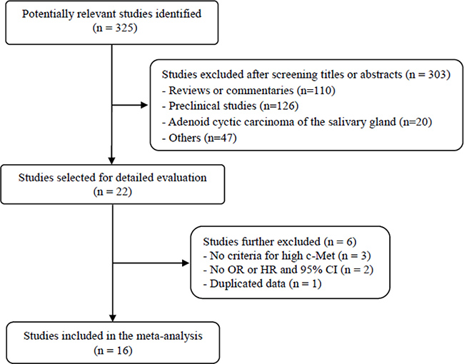 Figure 1 shows flow diagram of search process. A total of 325 potentially relevant studies were initially found, but 303 of them were excluded after screening the titles and abstracts. Of the remaining 22 potentially eligible studies, 6 were further excluded by the inclusion criteria: three had no definite criteria for high c-Met expression [24–26]; two had no available data to estimate hazard ratio (HR) or odds ratio (OR) with 95% confidence interval (CI) [27, 28]; one included duplicated data [29]. Finally, sixteen studies were included in the meta-analysis [30–45].