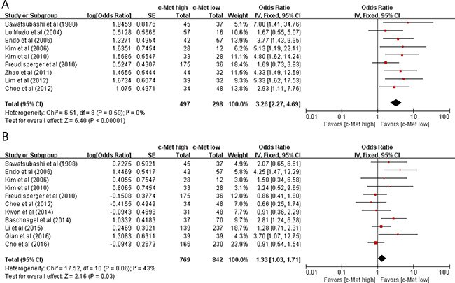 From eleven studies [30, 32, 33, 35, 36, 39–42, 44], 1,611 patients were included in the meta-analysis of ORs with 95% CIs for tumor T stage. There was a positive correlation between c-Met overexpression and higher T classification (T3 and T4) (OR = 1.33 [95% CI, 1.03–1.71], P= 0.03) (Figure 2B). The fixed-effects model was used because there was little heterogeneity among studies (X2 = 17.52, P = 0.06, I2 = 43%).