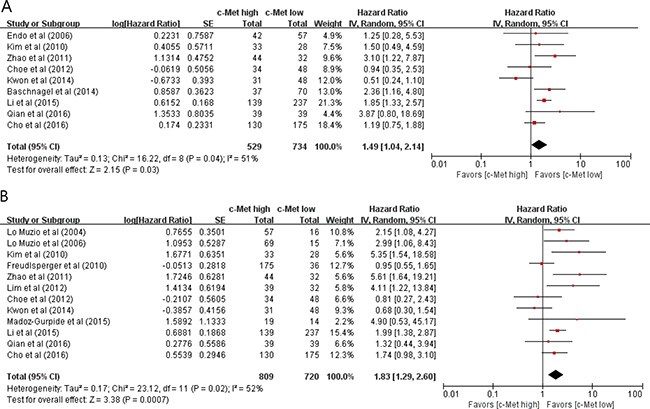 The following data were extracted from all eligible studies: the first author’s name, publication year, country, number of patients, tumor sites, T classification, LN metastasis, primary treatment, methods to test c-Met expression, cut-off values adopted to dichotomize c-Met expression status, and HR with 95% CI for DFS or OS and OR with 95% CI for pathological features.