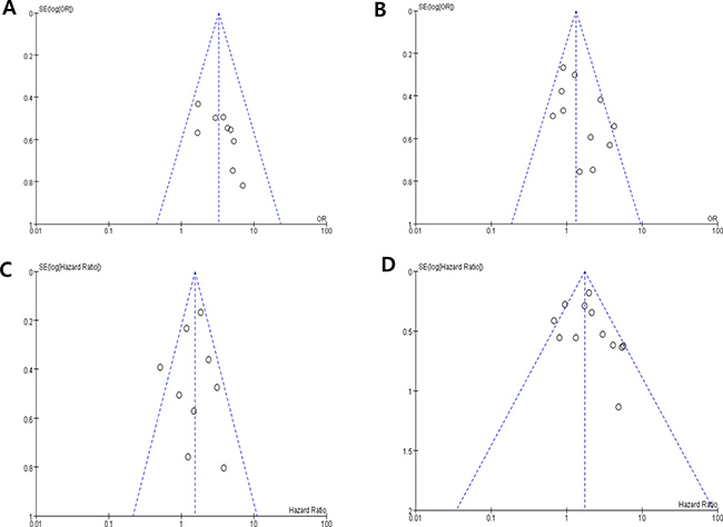 Figure 4: Funnel plots for publication bias regarding lymph node metastasis (A), T stage (B), disease-free survival (C) and overall survival (D).