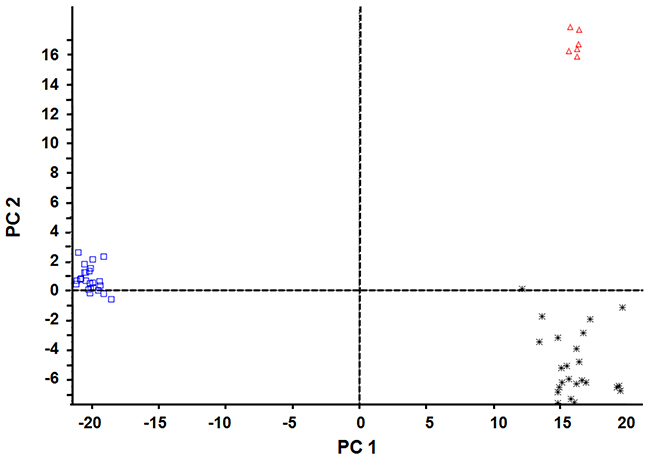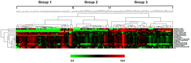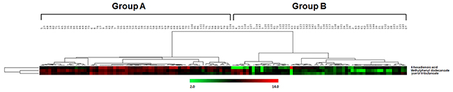 In this study, all the biological metabolites in serum samples from both GC patients and healthy people were detected by using HPLCESI/Q-TOFMS, providing lots of information for clarifying unknown molecular mechanisms for GC. There were obvious difference in the total ion current spectras of serum samples between GC patients and healthy people under the full-scan mode (in retention time of 11 minutes), which suggested that there might be some important metabolic changes in GC patients (Figure 1). By using compared t- test, a total of 87 metabolites in ESI+ mode were find to be statistically different between GC patients and healthy people (p<0.05) (Table 1). However, there were no statistically different serum metabolites in ESI- mode between GC patients and healthy people (Figure not shown). The clear identifications of each biological metabolites and their related effect in the biological processes are critical for the metabolomics’ researches. Compared with the data obtained from HMDB (www.hmdb.ca) databases, 87 metabolites in ESI+ mode were structurally confirmed.