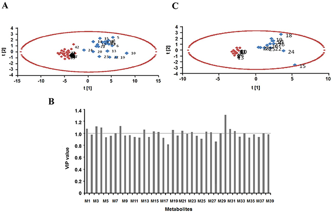 Firstly, both full-scan ESI+ and ESI- raw mass spectra was gathered by using data-acquisition software Analyst TF 1.5.1 (AB Sciex, California, USA). Then, the data like retention time, peak area and m/z ratio, was generated by using Marker View 1.2 (AB Sciex, California, USA) and the related serum metabolites were structurally confirmed by comparing the m/z ratio and ion mode of those metabolites with data shown in HMDB (www.hmdb.ca) databases. Subsequently, principal component analysis (PCA) was adopted in score plots to make a distinction between the similarity or difference of the scatters between GC patients and healthy controls, and thereby two sample t-test by using SPSS 22.0 (SPSS Inc., Chicago, USA) was performed to select potential biological variables which statistically significant different between GC patients and healthy controls. Additionally, the hierarchical clustering analysis was implemented by using BRB-Array Tools (Dr. Richard Simo & BRB-Array Tools Development Team, USA) to discriminate the subgroups and partial least squares discriminant analysis (PLS-DA) was applied by using simca-p software (Umetric AB, CA, USA) to identify the statistical important serum metabolites between GC patients and healthy controls. VIP plots of PLS-DA were drawn to ensure the correct potential serum biomarkers for both GC patients and healthy controls. The intensity of the background interference was normalized by using the global median subtraction method.