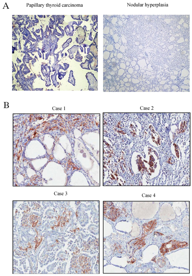 Figure 2: Immunohistochemical staining of XIAP in different tissues. (A), Nodular hyperplasia and PTC tissues; (B), ATC tissues (×200).