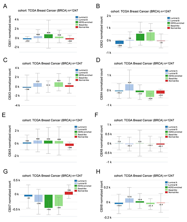 CBX2 was associated with Basal-like and HER-2 subtypes, while CBX4 and CBX7 was correlated to Luminal A and Luminal B subtypes of breast cancer