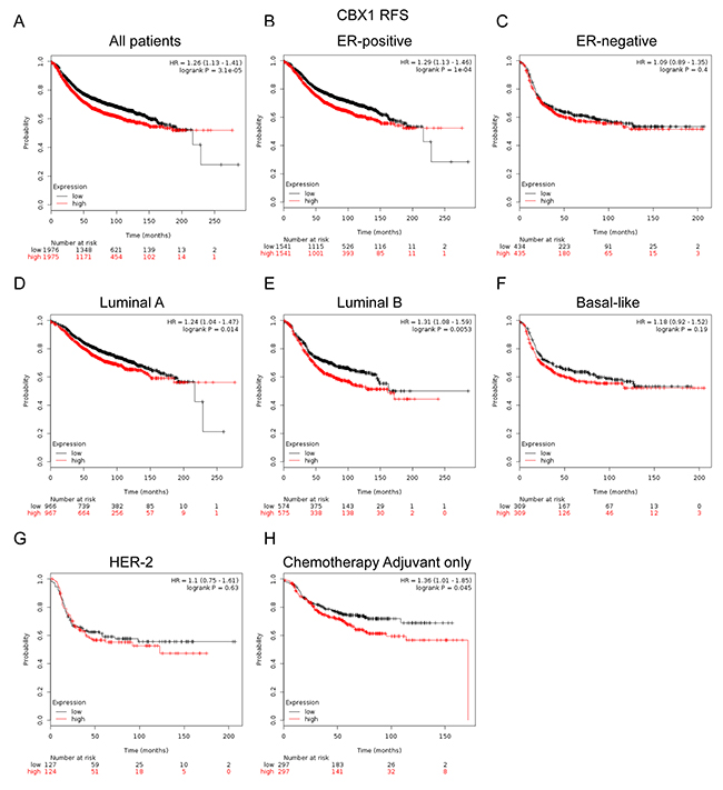 Figure 3: The prognostic values of CBX1 in breast cancer. (A) Elevated CBX1 mRNA level was significantly associated with shorter RFS in all BC patients. High mRNA level of CBX1 was significantly associated with poorer RFS both in ER positive (B), but not ER negative (C) BC patients. (D-G) High mRNA expression of CBX1 was significantly associated with shorter RFS in Luminal A and Luminal Bsubtype BC patients, but not in Basal-like and HER-2 subtype BC patients. (H) High mRNA level of CBX1 was associated with worse RFS in BC patients who have received adjuvant chemotherapy only.