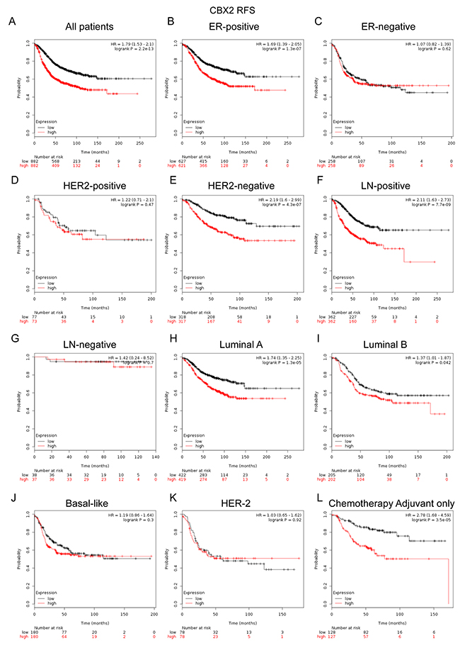 Figure 4: The prognostic values of CBX2 in breast cancer. (A) Elevated CBX2 mRNA level was significantly associated with poorer RFS in all BC patients. (B-C) High mRNA level of CBX2 was significantly associated with shorter RFS in ER positive, but not ER negative BC patients. (D-E) High mRNA level of CBX2 was significantly associated with shorter RFS in HER-2 negative, but not HER-2 positive BC patients. (F-G) High mRNA level of CBX2 was significantly associated with shorter RFS both in LN (lymph node) positive, but not LN negative BC patients. (H-K) High mRNA expression of CBX2 was significantly associated with shorter RFS in Luminal A and Luminal B subtype BC patients, but not in Basal-like or HER-2 subtype BC patients. (L) High mRNA level of CBX2 was associated with worse RFS in BC patients who have received adjuvant chemotherapy only.