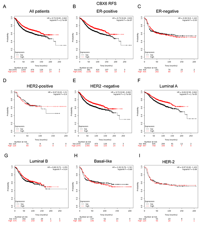 Figure 5: The prognostic values of CBX6 in breast cancer. (A) High mRNA level of CBX6 was significantly associated with longer RFS in all BC patients. (B-C) High mRNA level of CBX6 was significantly associated with longer RFS in ER positive, but not ER negative BC patients. (D-E) High mRNA level of CBX6 was significantly associated with longer RFS in HER-2 negative BC patients, but not in HER-2 positive BC patients. (F-I) High mRNA level of CBX6 was significantly associated with longer RFS in Luminal A subtype BC patients, but not in Luminal B, Basal-like or HER-2 subtype BC patients.