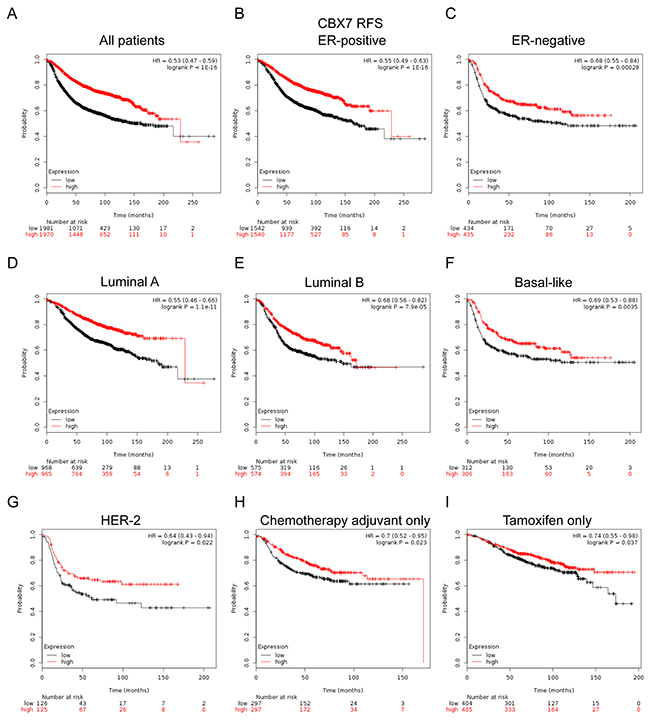 Figure 6: The prognostic values of CBX7 in breast cancer. (A) High mRNA level of CBX7 was significantly associated with longer RFS in all BC patients. (B-C) High mRNA level of CBX7 was significantly associated with longer RFS in both ER positive and ER negative BC patients. (D-G) High mRNA level of CBX7 was significantly associated with better RFS in Luminal A, Luminal B, Basal-like and HER-2 subtype BC patients. (H, I) High mRNA level of CBX7 was associated with longer RFS in BC patients who have received adjuvant chemotherapy only or tamoxifen only subgroup.
