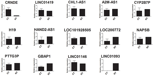 Figure 1: qRT-PCR analysis of fourteen lncRNAs expression in HCC tissues and adjacent normal tissues. CT: HCC tissues; NT, adjacent normal tissues.