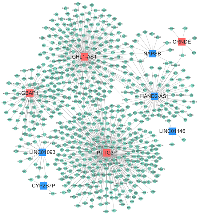 Figure 2: LncRNA-mRNA co-expression network. Red nodes represent up-regulated lncRNAs, blue nodes represent down-regulated lncRNAs, and green nodes represent mRNAs.