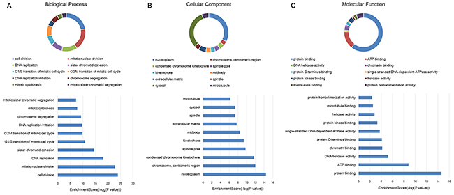 In this study, the gene ontology (GO) and KEGG pathway analyses were performed in all the mRNAs related lncRNA profiles. Since most of mRNAs were positively related to the lncRNAs (534 mRNAs in positive correlation and 73 mRNAs in negative correlation), we do not carry out separate enrichment analysis. GO analysis could classify genes into three categories, including biological process (BP), cellular component (CC) and molecular function (MF). From the top ten of the count number proportion and category enrichment analysis, cell division and mitotic nuclear division in the BP, nucleoplasm and cytosol in the CC, protein binding and ATP binding in the MF accounted for most of the proportion and the most significant correlation with HCC (Figure 3). In the enrichment analysis of KEGG pathway, a total of 12 pathways were significantly associated with the targeted mRNAs, of which cell cycle signal pathway was the most obvious. The details were shown in Figure 4.