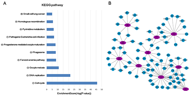 Figure 4: KEGG pathway enrichment analysis of target genes associated with lncRNA profiles. (A) Bar chart of the KEGG pathway enrichment analysis. (B) A network of genes related to the pathway.