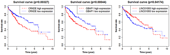 Figure 6: Survival curves showing the relationship between the lncRNAs and the overall survival rate.