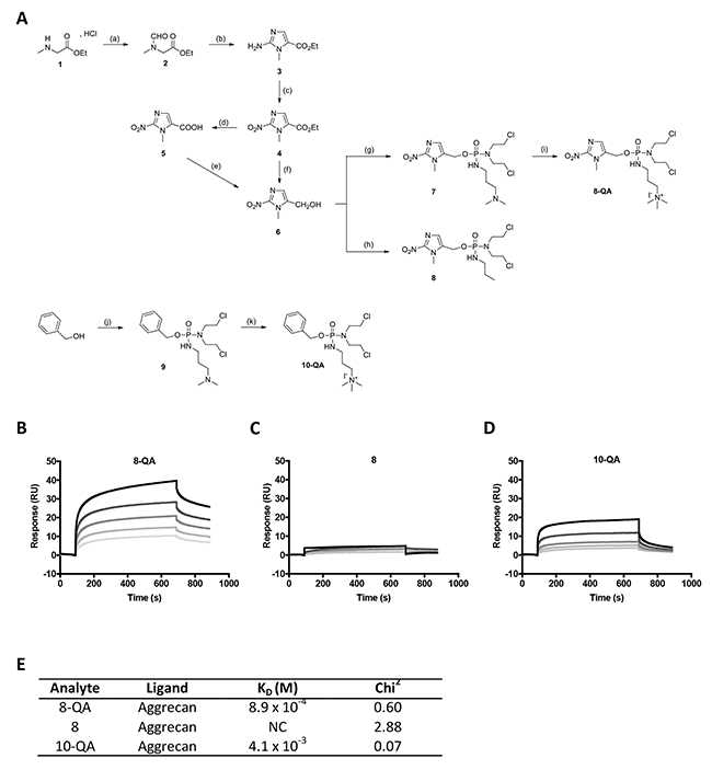 Figure 1: HAP synthesis and binding to immobilized aggrecan by SPR. (A) Scheme of HAP synthesis. Reagents and conditions : (a) ethylformate, K2CO3, EtOH, rt, 15-20 hours, 92%; (b) (1) ethylformate, NaH, 0 °C, rt, 15-20 hours, (2) HCl 37%, EtOH, 110 °C, 1 hour, (3) NH2CN, AcONa/AcOH, 95°C, 1 hour, 55%; (c) NaNO2, AcOH, rt, 15-20 hours, 75%; (d) NaOH, rt, 12 hours, 77%; (e) (1) isobutylchloroformate, TEA, THF anh., -20°C, 2 hours, (2) NaBH4, H2O, -20 to -10°C, 1.5 hours, 75%; (f) NaBH4, LiBr, THF/MeOH/H2O, 0°C, rt, 7 hours, 70%; (g) (1) bis(2-chloroethyl)phosphoramidic dichloride, Li(TMS)2N, THF anh., -78°C, 1 hour, (2) N,N-dimethylamino-1-propylamine, THF anh., -78°C, 1 hour, 48%; (h) (1) bis(2-chloroethyl)phosphoramidic dichloride, Li(TMS)2N, THF anh., -78°C, 1.7 hours, (2) n-propylamine, THF anh., -78°C, 20 minutes, 65%; (i) MeI, THF anh., 3.5 hours, 99%; (j) (1) NaH, bis(2-chloroethyl)phosphoramidic dichloride, toluene anh., 0°C, 15-20 hours, (2) N,N-dimethylamino-1-propylamine, 0°C, 2 hours, 88%; (k) MeI, THF anh., 3.5 hours, 78%. (B-E) SPR assays: Representative sensorgrams of 8-QA (B), 8 (C) and 10-QA (D) binding to aggrecan. All derivatives were injected at 1, 0.5, 0.25, 0.125, 0.0625 mM (from top to bottom) during 600 seconds on immobilized aggrecan at a flow rate of 30 μL/min. E. Dissociation constants (KD) were determined for each derivative by “steady-state affinity analysis”. All experiments were carried out in triplicate. NC: Non-calculable