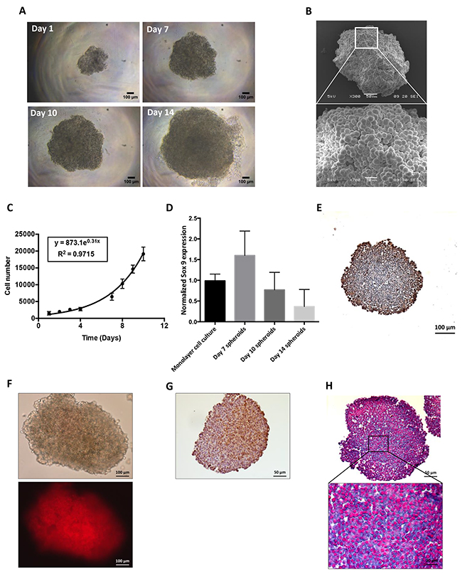 Figure 2: Characterization of HEMC-SS spheroids in terms of growth, hypoxia and proteoglycans. (A) Optical visualization of HEMC-SS spheroids at different stages of growth (Day 1, 7, 10 and 14). (B) SEM visualization of HEMC-SS spheroid at Day 10. (C) Growth–time curve of spheroids. Cell number was determined after spheroid trypsinization. (D) SOX-9 expression determined by qRT-PCR on HEMC-SS monolayer cell culture and on spheroids at Day 7, Day 10 and and Day 14. Data are represented as mean ± SD. (E) Ki-67 immunostaining on Day 10 spheroid section. Proliferative cells were mainly localized at the periphery of the spheroid. (F) Representative images of hypoxia on Day 10 spheroid using a LOX-1 probe for which fluorescent signal is only activated by hypoxic conditions. The LOX-1 hypoxia probe was added to spheroid culture medium at a final concentration of 200 μM, 24 hours before fluorescence detection. (G) Representative image of pimonidazole immunostaining of hypoxia on Day 10 spheroid section. Pimonidazole was added to spheroid at a final concentration of 200 μM one hour before fixation and paraffin-embedding. (H) Alcian blue staining on Day 10 HEMC-SS spheroid sections to evidence proteoglycans.