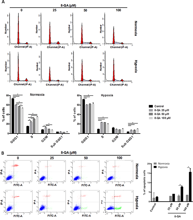 In order to characterize the mechanism of action of derivative 8-QA, cell cycle analysis and apoptotic cells were quantified on the human HEMC-SS chondrosarcoma cell line. As illustrated in Figure 3, in normoxia, 8-QA treatment led to an increase in S-phase (p < 0.001) associated with a decrease in G2/M phase, both in dose-dependent manner (p < 0.05) (Figure 3A). In hypoxia, 8-QA led to a high accumulation of cells in S and SubG0/G1 phases respectively to controls. An increased in Annexin V positive cells, as the consequence of apoptotic cascade and phosphatidylserine externalization, was observed after 8-QA treatment in hypoxia from 50 μM (i.e. 4.1-fold cell death at 100 μM, p < 0.001) (Figure 3B).