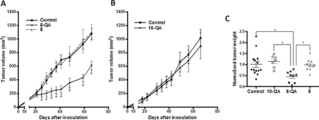 These results were confirmed by tumor weight assessment (Figure 5C), one day after the last injection, with significant decrease of 8-QA treated tumors as compared to controls (p = 0.008), 8 (p = 0.021) and 10-QA (p = 0.005).