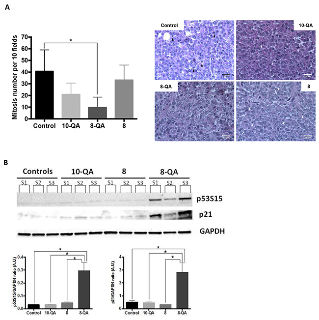 This antitumor efficacy was characterized on tumors sampled one day after the last injection (D41). Histological studies (Figure 6A) showed a significant decrease in mitotic index in tumor tissues from 8-QA-treated mice (9.7 ± 9.0 mitosis per 10 fields) compared to controls (40.8 ± 18.2 mitosis per 10 fields) (p = 0.033). Next, western blot evidenced a significant increased of phosphorylated-p53 (S15), leading to an induction of p21 observed only in 8-QA treated tumors (Figure 6B).