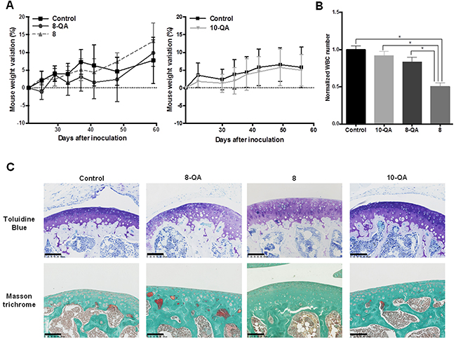 Figure 8: Side-effect evaluations. (A) Weight variation from Day 20 post-inoculation for 8 and 8-QA-treated mice (on the left) and for 10-QA treated mice (on the right). Data are represented as mean ± SD. (B) White Blood Cell (WBC) count (n≥4 per group of treatment) normalized to the control groups the day after last dose. Blood was sampled by retro-orbital puncture. Data are represented as mean ± SD. (C) Anatomopathological analysis of healthy cartilage from mouse knee joints sampled 24 hours after the last dose (n = 5 per group of treatment). Articular cartilages were stained by Toluidine blue and Masson trichrome to evidence proteoglycans and collagen respectively. Scale bar = 100 μm.