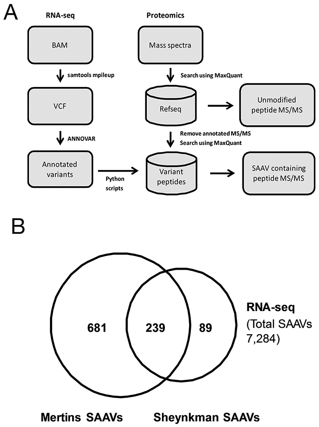 Figure 1: Analysis of RNA-seq variants in proteomics datasets. (A) Schematic illustration of the RNA-seq/Mass spectrometry-based variant peptide detection pipeline. (B) Overlap of unique SAAVs detected in the Mertins and Sheynkman datasets.