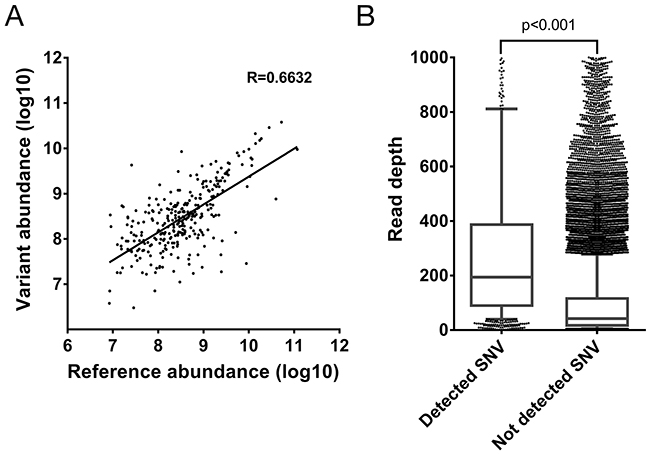 Finally, as the 1,010 SAAVs detected by mass spectrometry represent only 13.9% (n = 1,010/7,284) of all non-synonymous and nonsense SNVs detected by RNA-seq, we compared the read depth of SNVs corresponding to SAAV containing peptides with all remaining SNVs. The read depth in RNA-seq of identified SNVs was significantly higher than unidentified SNVs (median 194 versus 42 reads, p < 0.001, Mann-Whitney test) (Figure 3B). This suggests that SNVs that are in more highly expressed transcripts are more likely to be detected as SAAVs by mass spectrometry as the corresponding protein is also more abundant.
