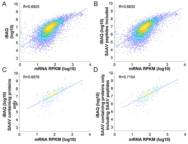 In total, 378 proteins contained SAAV containing peptides. Correlation of the updated iBAQ values incorporating the intensity of SAAV containing peptides (see Methods) across all proteins (n = 6,881) with the corresponding mRNA expression value showed a modest but significant (p<0.01, Williams’ (1959) t-test) increase in correlation coefficient (R = 0.6825 to R= 0.6830; Figure 4A, 4B). To more clearly illustrate the impact of the updated iBAQ values, we calculated the correlation of the updated iBAQ values specifically for the 318 proteins with SAAV containing peptides. In this case, the mRNA expression value showed a more significant (p<0.0001, Williams’ (1959) t-test) increase in correlation coefficient, from R = 0.6978 to R = 0.7154 (Figure 4C, 4D). Although mRNA expression level is not an accurate measure of protein expression [9], the improved correlation that we observed over a pool of hundreds of proteins suggests that the inclusion of SAAV containing peptides in protein quantification may be beneficial to the accuracy of quantitative proteomics experiments.