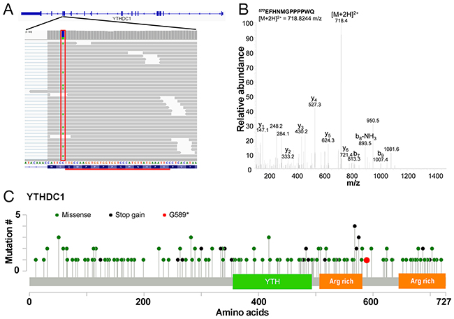 Figure 5: Truncation mutation in YTHDC1. (A) Illustration of the C>A/G>T SNV at chr4:69184242 (boxed in red) on the YTHDC1 gene resulting in a G589* SAAV. The tryptic peptide EFHNMGPPPPWQ detected as a result by mass spectrometry is underlined in black. (B) Representative tandem mass spectrum of the doubly charged ion of EFHNMGPPPPWQ. (C) Mutation map of COSMIC mutations across YTHDC1 showing the YTH domain and arginine (Arg) rich regions.