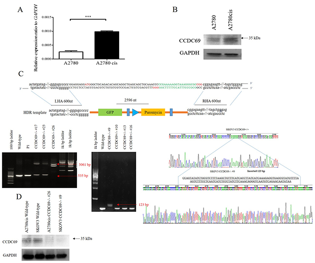Figure 1: Overexpression of CCDC69 in A2780cis cells and generation of CCDC69 knockout A2780cis and SKOV3 cells using the CRISPR/Cas9 system. (A) The relative expression level of CCDC69 was elevated in A2780cis cells compared with A2780 cells by Real-time RT-PCR. GAPDH was used as a loading control. Data represent the mean and the standard deviation from three independent experiments. ***p < 0.001 versus A2780 cells (Student’s t-test). (B) The level of CCDC69 protein was overexpressed in A2780cis cells compared with A2780 cells by western blot analysis. The upper band marked as around 35 kDa as arrow indicated. Detection of GAPDH was used as a loading control. (C) Upper panel: Schematic representation of the CCDC69 genomic region, targeted PAM positions, and primer positions. Knockout CCDC69 allele containing the GFP-puromycin cassette. PAM, protospacer adjacent motif. HDR, homologous directed repair. LHA, left homologous arm. RHA, right homologous arm. Black arrows indicate primer positions. Lower panel: Two CCDC69-knockout cell lines were established from A2780cis and SKOV3 cells, respectively. The CCDC69 genomic region was analyzed by PCR. Amplicons were separated in agarose gels. Using the 69F + 69R primer set, the 535 bp wild type region was amplified in A2780cis and SKOV3 cells, whereas longer amplicons were detected in CCDC69-knockout cell lines. A2780cis CCDC69-/- #26 cells have insertions of 2596 bp and SKOV3 CCDC69-/- #9 cells have insertions of 123 bp. Red arrows indicate successful donor oligonucleotide genomic integration. (D) CCDC69 protein levels in the indicated cell lines. CCDC69 protein expression was analyzed by Western blot analysis. GAPDH was used as the loading control.