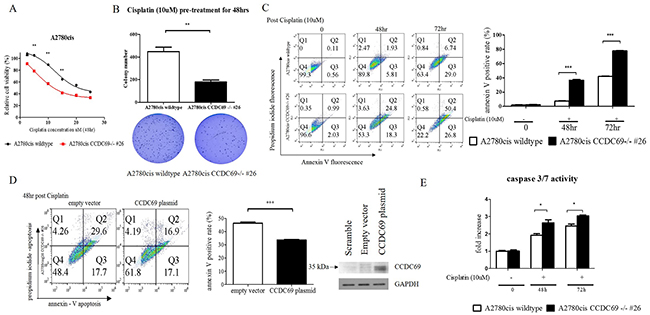 Figure 2: Depletion of CCDC69 in A2780cis ovarian cancer cells enhanced cisplatin induced-apoptosis. (A) Sensitization of cells to cisplatin after CCDC69 knockout as revealed by the CCK-8 cytotoxicity assay. (B) Number of colonies were significantly decreased in A2780cis CCDC69-/- #26 cells as revealed by colony formation assays. The colonies were counted using Image J software. (C) Apoptosis was analyzed by flow cytometry after annexin V and propidium iodide staining. Cells were incubated with and without cisplatin (10 uM) for 48 hr and 72 hr. Total apoptosis is the sum of the percentage of annexin V only and annexin V/propidium iodide stained cells. (D) Confirmation of CCDC69 expression in A2780cis CCDC69-/- #26 cells transfected with plasmids expressing the indicated CCDC69 protein. Stained annexin V of the transfected cells after treatment with cisplatin were assessed by flow cytometry. (E) Increase cleavage of caspase 3/7 activity after treatment with cisplatin.