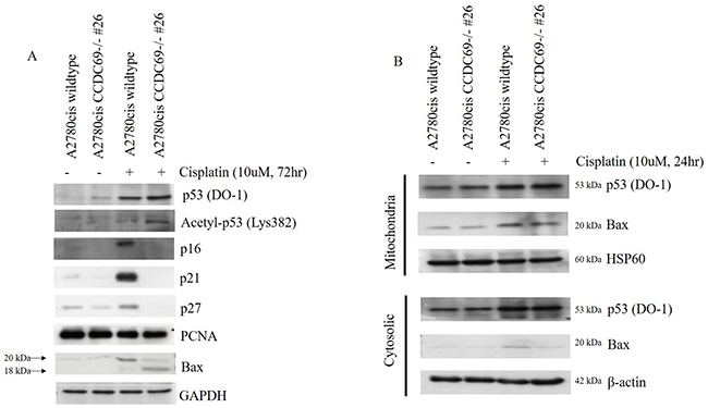 Figure 4: Effect of CCDC69 deletion on expression of p53, acetyl-p53-382 and Bax in response to cisplatin. (A) The extracted protein samples were analyzed using antibodies against the indicated proteins. Equal protein loading was confirmed by Western blotting for GAPDH. (B) After treatment A2780cis wildtype and A2780cis CCDC69-/- #26 cells with 10 μM cisplatin for 24 h, cytosolic and mitochondrial fractions were obtained. The amounts of protein loaded were 20 μg for cytosol and crude mitochondria. HSP60 and β-actin were used as specific marker proteins for mitochondria and cytosol, respectively.
