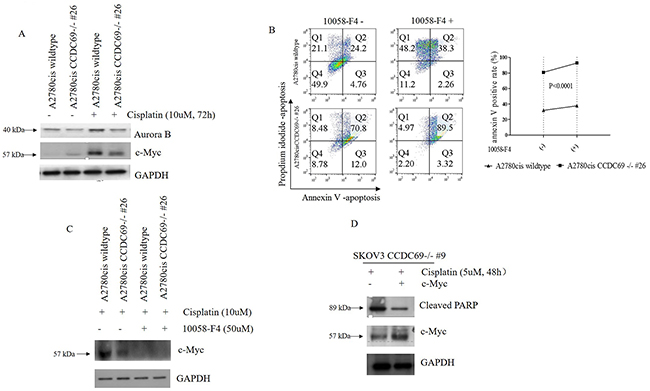 It has been shown that Aurora B inhibition in HeLa cells led to the mislocalization of CCDC69 at the central spindle and c-Myc has been shown to mediate Aurora B expression [21, 37]. To identify the involvement of c-Myc and Aurora B after CCDC69 depletion in A2780cis wildtype and A2780cis CCDC69-/- #26 cells, we performed western blotting assays. Consistent with previous studies, cisplatin treatment resulted in upregulation of Aurora B in both cell lines [38, 39]. However, the upregulation of aurora B was more pronounced in A2780cis wildtype cells (Figure 5A). Results also showed c-Myc protein expression was elevated in cisplatin resistant A2780cis wildtype cells compared to the A2780cis CCDC69-/- #26 cells after 72 hr cisplatin treatment (Figure 5A). To know if c-Myc plays a direct role on blocking cisplatin-induced apoptosis, we used the c-Myc inhibitor 10058-F4 to inhibit c-Myc activity by targeting c-Myc-Max interaction. Our data showed that inhibiting c-Myc in A2780cis CCDC69-/- #26 cells had enhanced cisplatin-induced apoptosis in contrast to the A2780cis wildtype cells (P<0.0001, Figure 5B). As shown in Figure 5C, c-Myc expression level was decreased after treatment with 50uM 10058-F4 for 24 hrs (Figure 5C). The c-Myc protein expression level was upregulated in SKOV3 CCDC69-/- #9 cells after transiently transfection with c-Myc plasmid, as supported by western blotting analysis (Figure 5D). We observed that SKOV3 CCDC69-/- #9 cells showed resistant to this cisplatin treatment after c-Myc expression as evident by the induction of apoptosis (Figure 5D). These results suggest that the c-Myc mediated cisplatin induced apoptosis in CCDC69 knockout ovarian cancer cell lines.