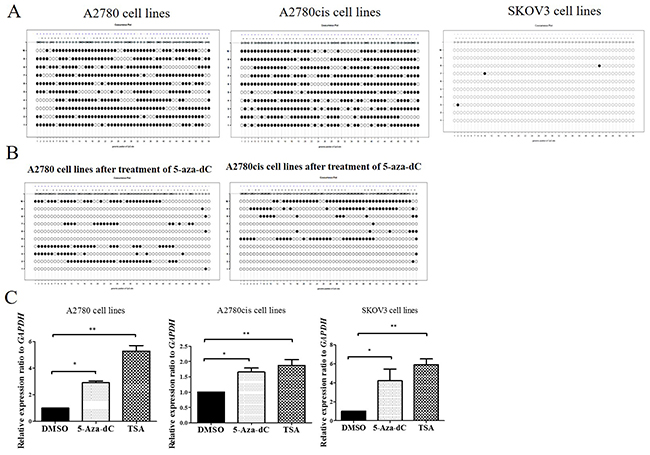 Figure 6: DNA methylation analysis of promoter regions of CCDC69 in ovarian cancer cell lines. (A) Representative methylation patterns in promoter regions of CCDC69 in A2780, A2780cis and SKOV3 ovarian cancer cell lines before treatment with 5-aza-dC. (B) Representative methylation patterns in CCDC69 CpG islands observed in A2780 and A2780cis after treatment with 5-aza-dC. (C) Effect of 5-aza-dC and TSA on CCDC69 expression in A2780, A2780cis and SKOV3 ovarian cancer cell lines. Bisulfite sequencing was performed and the results were visualized by MethVisual [28]. Lollipop displays for each 10 cloning methylation profiles in the genomic context are shown. Filled dots refer to methylated sites, empty dots to non-methylated sites. Each clone of the experiment is displayed separately according to its methylation status. Lengths of the connecting lines correspond to relative genomic distance between CpG sites. Mann–Whitney U-test, (*) P < 0.05; (**) P < 0.01.