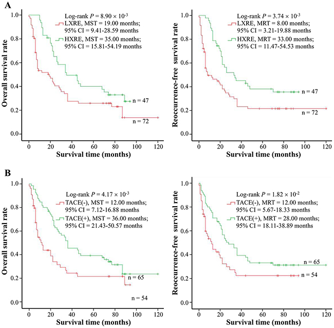 The clinicopathological features of the patients are shown in Table 1. A total of 421 patients with hepatocarcinoma were included in the present study with an average age of 47.8 ± 10.2 years. The HBV and HCV infective rates were 73.9% (311 of 421) and 11.6% (49 of 421), respectively. About 40% of hepatocarcinoma cases were in the 0 –A stage of the Barcelona Clinic Liver Cancer (BCLC) staging system, and accepted the radical surgical therapy. At a median follow-up of 60 months, 257 featured tumor recurrence with 30.00 (22.11-37.89) months of median tumor recurrence-free survival time (MRT), and 266 died with 45.00 (38.88-51.13) months of median overall survival time (MST).