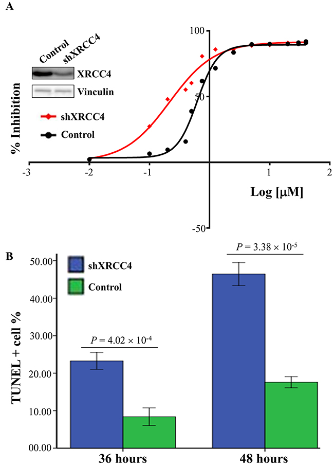 Cells were seeded in six-well plates for 24 hours, and then transfected with pcDNA3.0-XRCC4 or shXRCC4 using Lipofectamine™ 2000 transfection reagent (Life Technologies Corporation) following the manufacturer’s instructions. After 48 hours, cells were treated with doxorubicin at final concentrations of 1.25 μM for 36 or 48 hours. After that, the cells were all harvested and analyzed by TUNEL staining using an in situ cell death detection kit (Roche, Mannheim, Germany) in combination with 4,6-diamino-2-phenyl indole staining. TUNEL-positive cells were counted in at least 300 cells in randomly chosen fields. The data were expressed as a percentage of TUNEL positive cells to total cells [11].