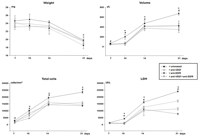Figure 1: Weight, volume, total cells count and lactate dehydrogenase (LDH) of malignant pleural effusion of mice injected with LLC cells treated with anti-VEGF and/or anti-EGFR and untreated. *p<0.05 when compared by temporal evaluation and # p<0.05 when compared the groups.