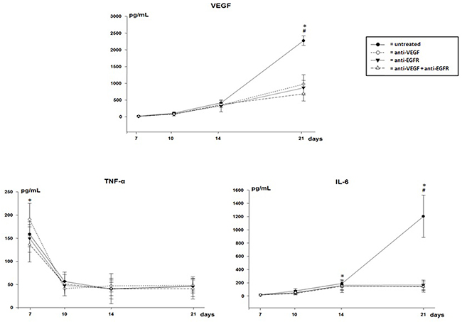 Figure 3: VEGF, TNF-α and IL-6 in pleural effusion of mice injected with LLC cells treated with anti-VEGF and/or anti-EGFR and untreated. *p<0.05 when compared by temporal evaluation and # p<0.05 when compared the groups.