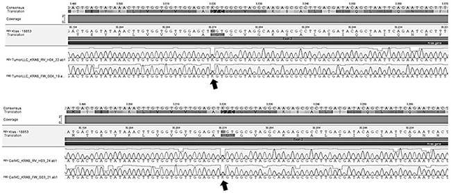 Figure 5: Genetic sequencing showing mutation (arrows) in exon 2 of KRAS gene in culture of LLC cells and tumor tissue of mice after LLC cells implantation.