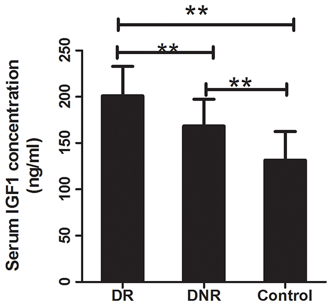 Figure 1: Serum concentration of IGF1 in DR, DNR and healthy control. Compared with the healthy controls, serum concentration of IGF1 was significantly increased in DR and DNR groups (P<0.01 for both). Moreover, DR exhibited obviously increased serum IGF1 concentration compared to the DNR group (P<0.01). **: indicated P<0.01.