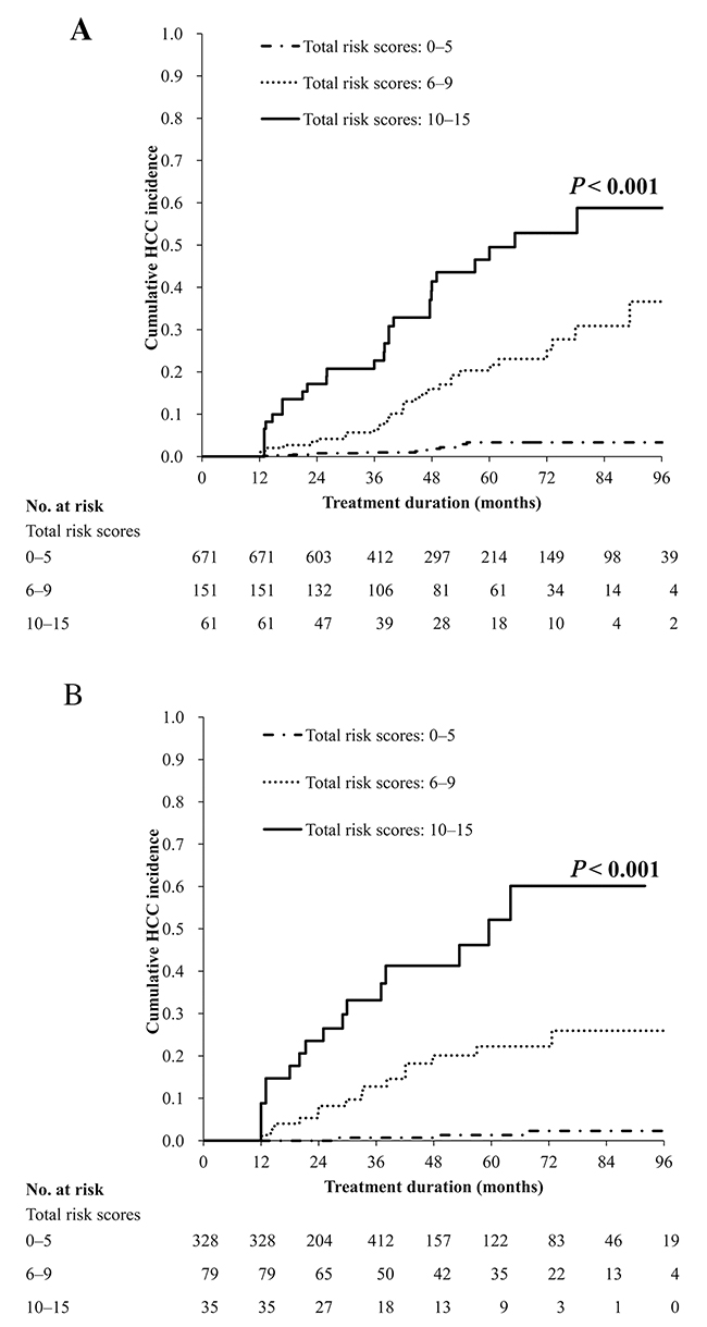 To develop the HCC risk prediction model, we randomly assigned all patients to the model development or validation group in a 2:1 ratio using the RANUNI function in SAS. The baseline and on-treatment host and viral profiles of patients in the development group were used to establish the prediction model, whereas those of patients in the validation group were used to assess its predictive accuracy.