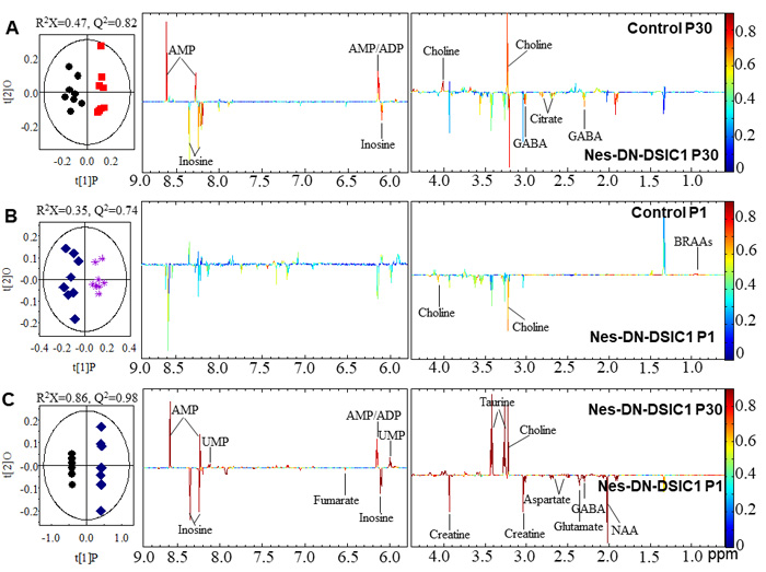 Figure 3: O-PLS-DA scores and coefficient-coded loadings plots for the models discriminating between the two compared groups. The models are constructed from NMR spectra of aqueous brain extracts obtained at the age of P1 and P30. A. Comparison of control and Nes-DN-DISC1 mice at P30. B. Comparison of control and Nes-DN-DISC1 mice at P1. C. Comparison of Nes-DN-DISC1 mice between age P1 and P30. The cross-validation parameters with CV-ANOVA, Metabolite key to the numbers are shown in Supplementary Table 1.