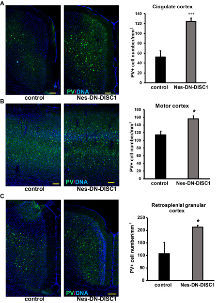 Figure 4: Increased PV interneuron number in different brain regions. DN-DISC1 is induced from E0 to P0 and mice are sacrificed at 2 months old for PV staining (green). PV interneurons are shown as the density divided by area in following regions: A. the cingulate cortex, B. motor cortex and C. the retrosplenial granular cortex. n = 4-6. *, p < 0.05; ***, p < 0.005; t-test. Scale bar = 100 µm.