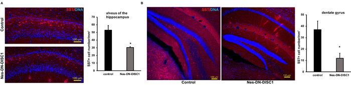 Figure 6: Decreased SST interneuron number in different brain regions. DN-DISC1 is induced from E0 to P0 and mice are sacrificed at 2 months old for SST staining (red). SST interneurons are shown as the density divided by area in following regions: A. the alveus of the hippocampus, B. the DG. n = 4-6. *, p < 0.05; ***, p < 0.005; t-test. Scale bar = 100 µm.
