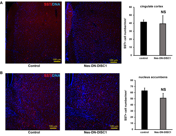 Figure 7: SST interneuron number is not changed in some brain regions. DN-DISC1 is induced from E0 to P0 and mice are sacrificed at 2 months old for SST staining (red). SST interneurons are shown as the density divided by area in following regions: A. the cingulate cortex, B. the nucleus accumbens. n = 4-6. Scale bar = 100 µm.