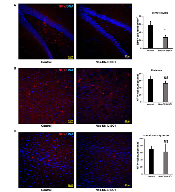 Figure 8: NPY interneuron number in different brain regions. DN-DISC1 is induced from E0 to P0 and mice are sacrificed at 2 months old for NPY staining (red). SST interneurons are shown as the density divided by area in following regions: A. the DG, B. the thalamus, C. the somatosensory cortex. n = 4-6. *, p < 0.05; t-test. Scale bar = 50 µm.