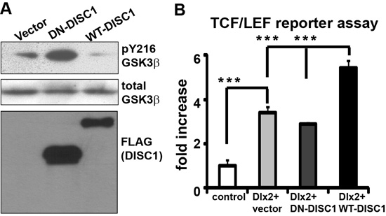 Figure 11: Impact of DN-DISC1 expression on the Wnt signaling. A. Vector, WT- and DN-DISC1 were transfected into N2a cells and cell lysates were blotted with anti-pY216 GSK3β, total GSK3β and FLAG antibody. B. WT-DISC1 synergized with Dlx2 to activate Wnt activity. However, DN-DSIC1 impaired Dlx2-WT-DISC1 synergy in the Wnt pathway. N = 4, ***, p < 0.001, t-test.