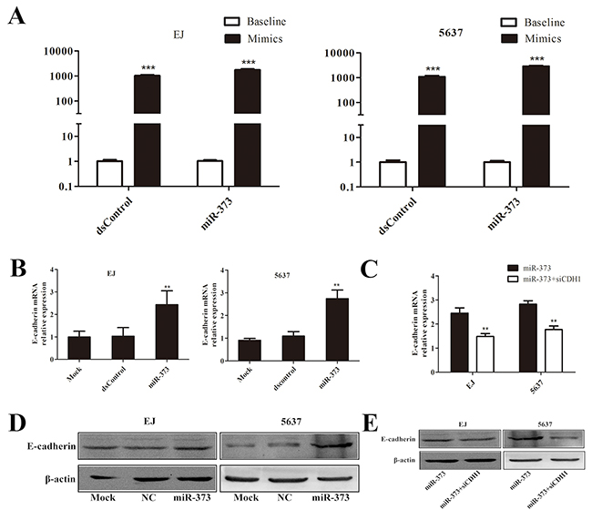 Both miR-373 and E-cadherin were verified to be relate to BCa progression, the Pearson correlation coefficient analysis was applied to detect the relationship between miR-373 and E-cadherin expression levels. Result showed that the expression level of miR-373 was positively correlated with the level of E-cadherin expression in BCa and adjacent normal tissues (Figure 1E; r = 0.63, P<0.0001 and Figure 1F; r = 0.56, P<0.0001).