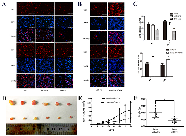 To further confirm the changes of cell proliferation induced by miR-373, an EdU assay was conducted and the outcomes showed over-expression of miR-373 suppressed cells proliferation in two BCa cell lines (Figure 5A and 5C). While co-treatment with siCDH1, the cells proliferation ability was restored (Figure 5B and 5C). Then, the EJ cells were stably transfected miR-373 or dsControl, and the transfected EJ cells were used to generate the xenograft model in nude mice. As shown in Figure 5D, Lenti-miR-373 significantly inhibited xenograft tumor growth. Besides, the average tumor volume and weight in Lenti-miR-373 group was remarkably decreased and lightened compared with the Lenti-dsControl group at 4 weeks post injection, respectively (Figure 5E and 5F).