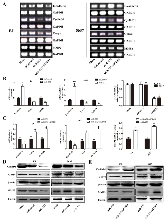 Figure 6: MiR-373 inhibits E-cadherin’s downstream genes Cyclin D1, C-myc and MMP2 expression. The expression of E-cadherin, Cyclin D1, C-myc and MMP2 mRNAs were detected by reverse transcription PCR (RT-PCR) (A) and qRT-PCR (B and C). GAPDH served as a loading control. MiR-373 increased E-cadherin and suppressed CyclinD1, C-myc and MMP2 mRNAs expression. After co-transfected with siCDH1, miR-373 failed to up-regulate E-cadherin or down-regulated Cyclin D1, C-myc and MMP2 mRNA levels (*P<0.05, **P<0.01 ***P<0.001). (D) Expression of Cyclin D1, C-myc and MMP2 protein were detected by Western blot. β-actin served as a loading control. Cyclin D1, C-myc and MMP2 proteins were lower compared with mock and dsControl group in EJ and 5637 cells. (E) Co-transfected with siCDH1 contributed to the targeted genes significant increase in two cell lines.